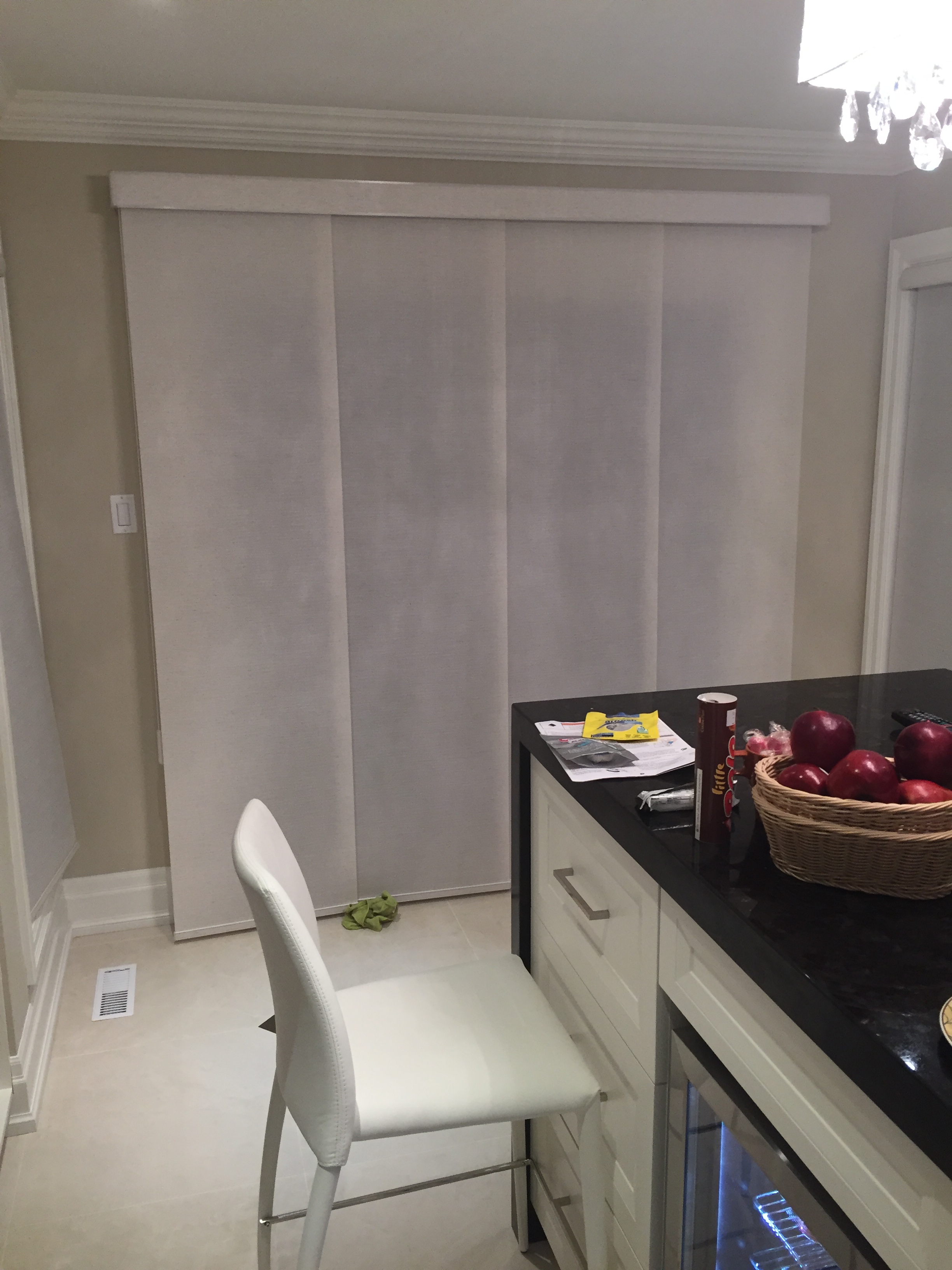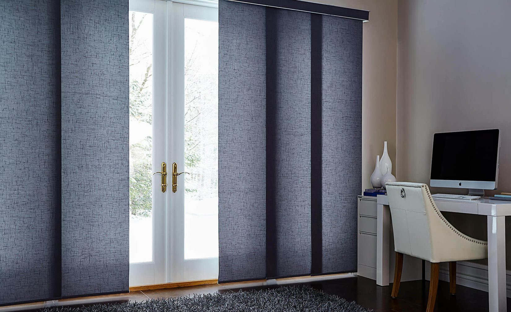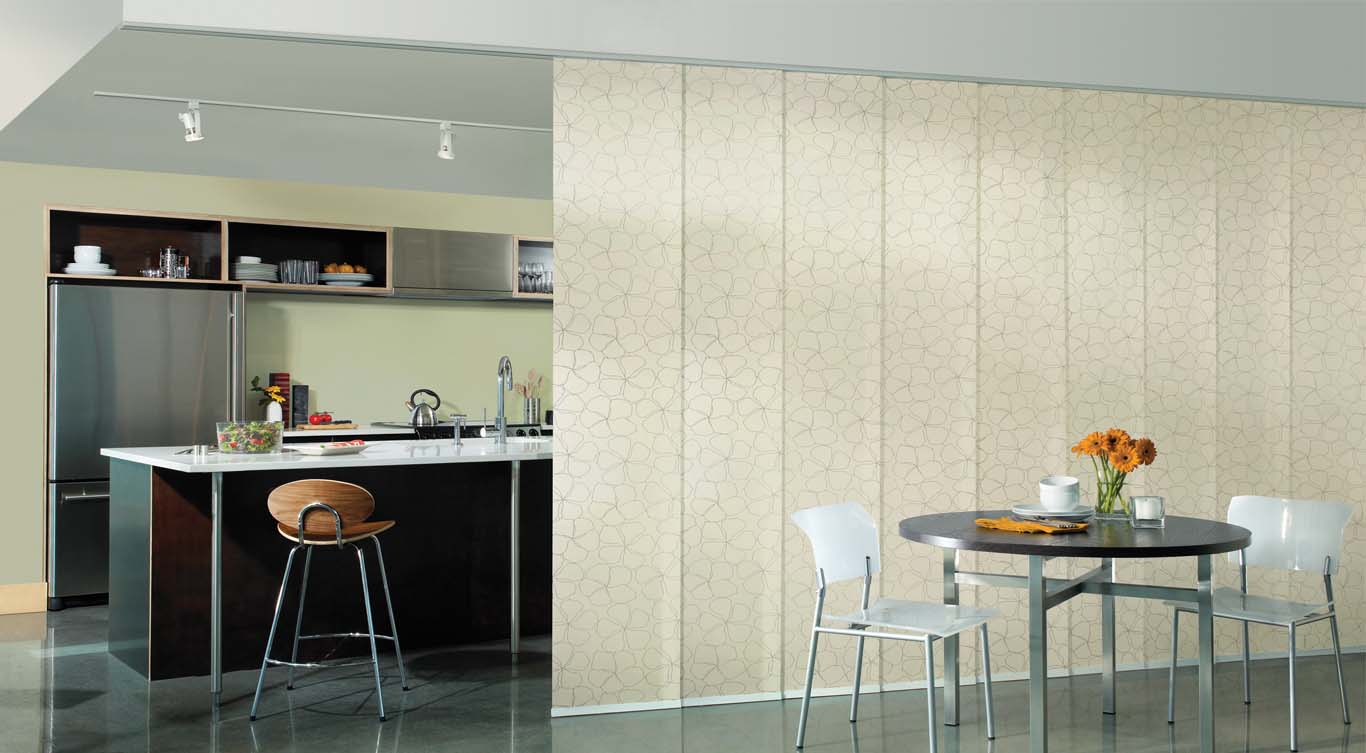 Panel Tracks are a type of window covering that operate similarly to vertical blinds but with a much softer look. With a long piece of fabric hanging from a track, they move back and forth to open and close. Made out of the same fabric as roller shades, Panel Tracks compliment them in areas where roller shades are not the optimal choice, such as large doors.