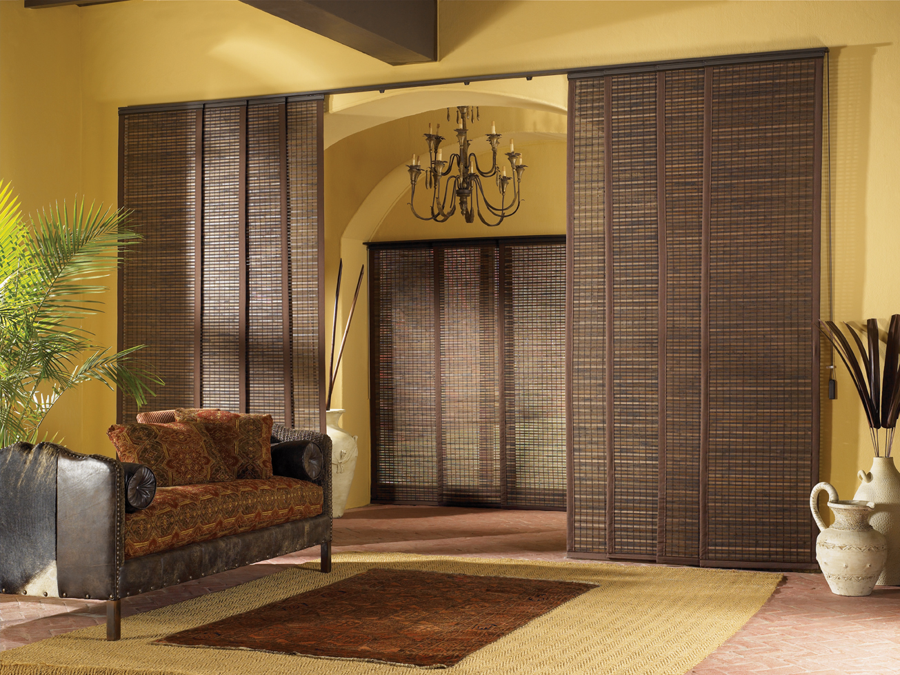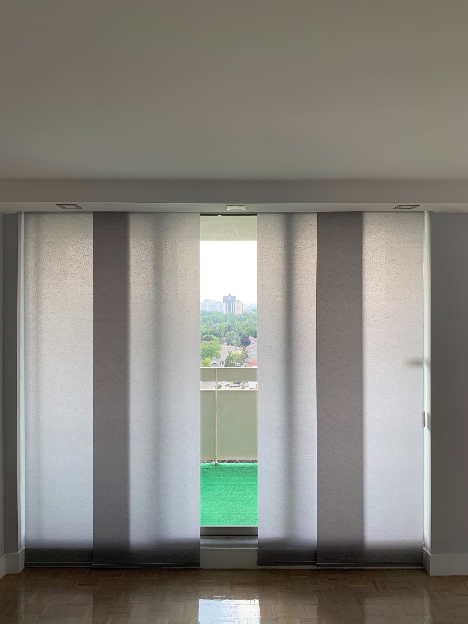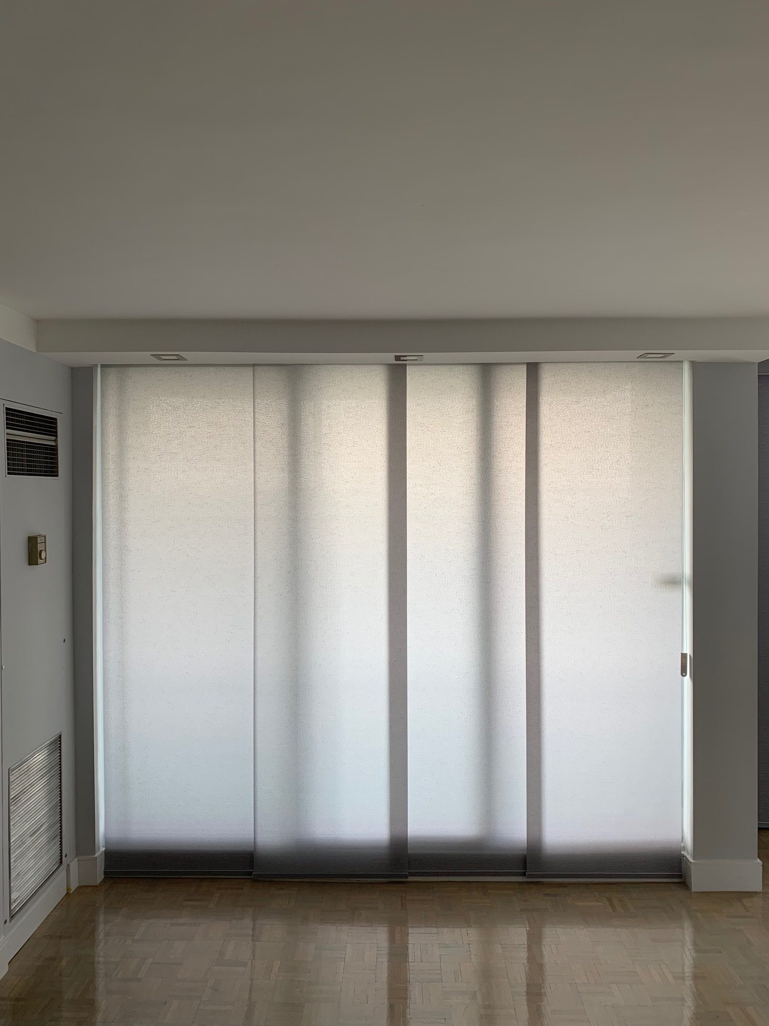 Panel Tracks are a type of window covering that operate similarly to vertical blinds but with a much softer look. With a long piece of fabric hanging from a track, they move back and forth to open and close. Made out of the same fabric as roller shades, Panel Tracks compliment them in areas where roller shades are not the optimal choice, such as large doors.